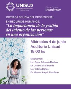 En un contexto donde la gestión del capital humano se ha convertido en un factor estratégico para el crecimiento y sostenibilidad de las organizaciones, la Universidad de la Integración Sudamericana (UNISUD) organiza una jornada académica para celebrar el Día del Profesional en Recursos Humanos. El encuentro se llevará a cabo el miércoles 4 de junio a las 18:00 horas en el auditorio de la institución ubicado sobre avenida Mitre 1518 de Posadas.