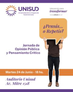 La Universidad de la Integración Sudamericana (UNISUD) será escenario de una propuesta académica que interpela directamente al presente: “¿Pensás o repetís?”, una jornada de Opinión Pública y Pensamiento Crítico que invita a detenerse y pensar qué discursos moldean nuestras ideas, decisiones y percepciones cotidianas.